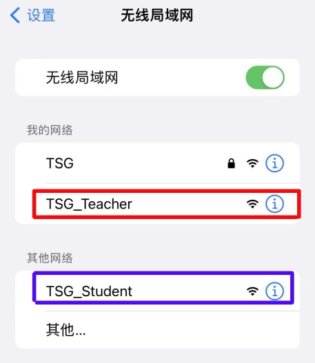 使用移动设备寻找无线网络,教师请选择“TSG_Teacher”,学生请选择“TSG_Student”。