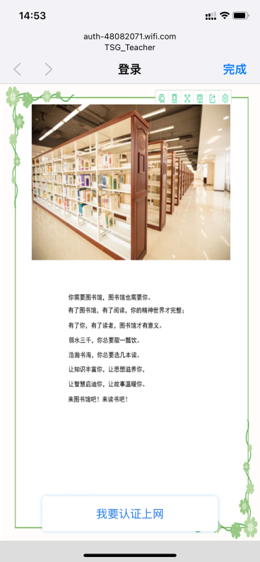 信号接入后,会弹出认证页面,点击“我要认证上网”。