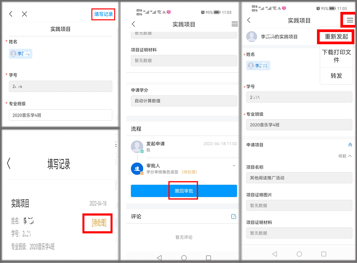 2.通过“填写记录”查看审核情况,在“待处理”期间,可进入该条记录通过“撤回审批”“重新发起”对实践项目进行修改。