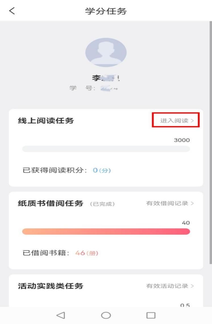 1.完成线上阅读任务。点击“学分任务”栏,“进入阅读”后点击“立即报名”,参加线上阅读积分活动,每阅读1分钟可获得10积分,累积达2000积分,可获0.5学分。